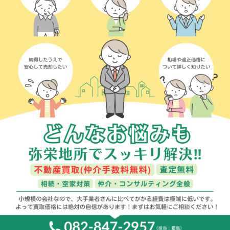 相続した不動産、売るかどうか決まっていなくても大丈夫です。 2025.12.27 ニュース 広島市安芸区・安芸郡の不動産買取専門|相続・空き家・古家を高価買取する地元業者の徹底解説 2025.12.10 ニュース 弥栄地所SDGs宣言 2025.12.1 ニュース